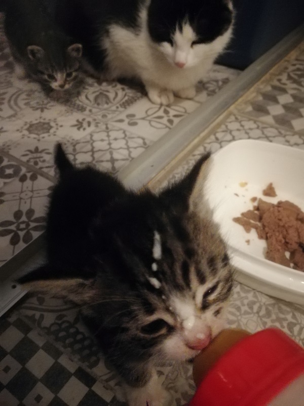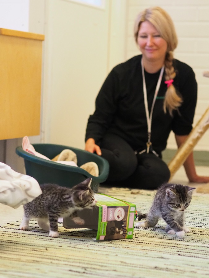 Oikealla kuvassa leikitän Riiaa ja Ressua, jotka ovat yksi viime vuoden mieleenpainuvin kaksikko ja selviytymistarina. Pennut olivat neljä vuorokautta erossa emostaan oman onnensa nojassa, ennen kuin löytyivät. Pikkuiset olivat pahasti kuivuneita, eikä emoltakaan tullut enää maitoa, mutta yösyötön voimin ne vahvistuivat. Alla olevassa kuvassa harjoitellaan tuttipullosta syömistä, Reija emon vahtiessa taustalla. Ollessaan 14-viikkoisina luovutusikäisiä, kisut pääsivät temmeltämään uuteen, yhteiseen kotiinsa. Uudesta kodista olenkin saanut erittäin vauhdikkaita kissavideoita!